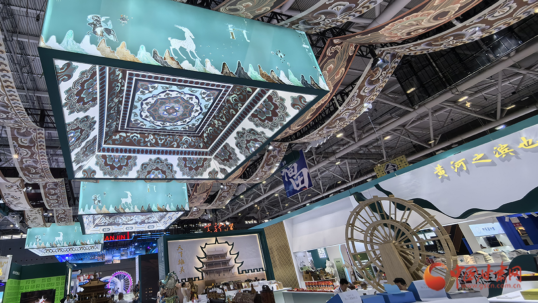 據(jù)了解,甘肅主題館位于深圳國(guó)際會(huì)展中心文化產(chǎn)業(yè)綜合展9號(hào)館,展陳面積510平方米,以主線貫穿、特色鮮明、視覺(jué)宏觀、內(nèi)容豐富為總體設(shè)計(jì)宗旨,采用敦煌壁畫(huà)中石綠為主色調(diào),頂部裝飾敦煌壁畫(huà)中藻井圖及線條,融入“九色鹿”“飛天”等設(shè)計(jì)元素,突出甘肅的歷史感和雄渾大氣。
