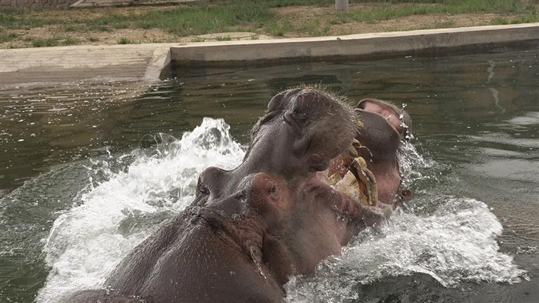 “小乖”今年正值青春活潑的年紀(jì),性格溫順可愛。經(jīng)過一段時(shí)間的精心準(zhǔn)備與適應(yīng)期,“小乖”已經(jīng)與老住戶“大嘴”和諧相處,一同在水中暢游、嬉戲玩耍,或是在岸邊悠閑進(jìn)食、曬著太陽。兩只河馬的互動(dòng)與陪伴,給園區(qū)增加了許多樂趣,也給游客們帶來更加新奇、歡樂的觀賞體驗(yàn)。