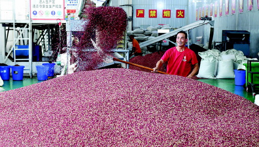 9月10日,甘谷花椒集散交易中心工人正在加工收購的花椒。甘谷花椒種植歷史悠久,所產(chǎn)花椒色澤鮮紅、粒大肉厚、麻味悠長、清香濃郁,是國內(nèi)紅花椒中的精品。目前,全縣花椒種植面積22萬畝,預(yù)計年產(chǎn)量1.6萬噸以上,產(chǎn)值11.5億元以上,花椒樹真正變成了群眾致富的“搖錢樹”。 新天水·天水日報記者李旺旺攝