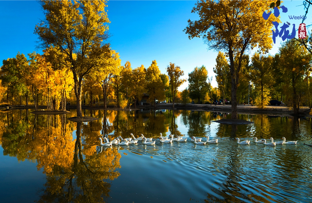 金色的胡楊倒映在蔚藍(lán)的水中,白鵝嬉戲,構(gòu)成了一幅幅色彩對比強(qiáng)烈、視覺沖擊力極強(qiáng)的絕美畫面。