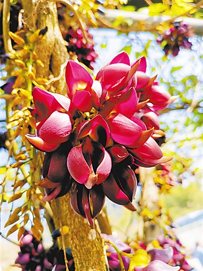 我終于登上山巔,來到那個罕見的常春油麻藤家族旁邊,眼前的景象,比我想象的更震撼。傷痕累累的蒼勁老藤猶如飛龍騰空而起,盤旋而上。只是,眼前的飛龍,是一條掛滿鮮花的飛龍。成千上萬的花朵,密密麻麻包裹著幾根老藤,每一朵,都像是紫色的飛鳥。這些花不是同時開放的:最早的已經(jīng)掉在地上,就像一群小鳥落地休息;更晚的還沒有吐出花蕊,像是巢中幼鳥,還在閉眼做夢;數(shù)量最多的,正迎風怒放,雖然是陰天,但透進樹林的弱光,讓它們格外明亮。