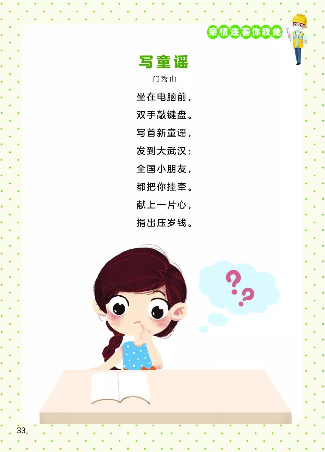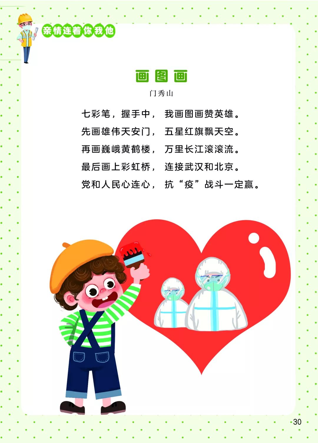 新冠肺炎疫情爆發(fā)以來,全國人民積極投入到疫情防控阻擊戰(zhàn)中,孩子們、兒童文學作家也紛紛發(fā)聲,創(chuàng)作了大量優(yōu)秀的童謠。每一首童謠是一聲鼓勁的吶喊,匯集起來就是嘹亮的戰(zhàn)歌;每一首童謠點亮一束希望的光,光束匯聚就是光明的未來。