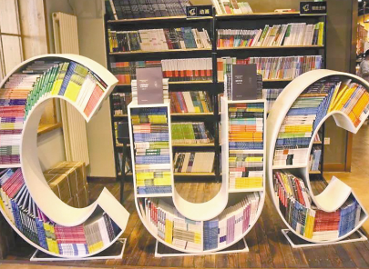 圖書(shū)被碼成中國(guó)傳媒大學(xué)的校標(biāo)形狀,這成為中傳知行書(shū)店的一處閱讀風(fēng)景。