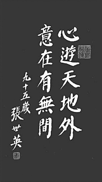 張先生今年正好百歲,照過去的觀念,當(dāng)然是長壽了。但是在我們的心目中,張先生現(xiàn)在去世,還是太早了,令我們無限悲痛!前年(2018年)12月18日,《張世英書法集》出版,我們在燕南園56號院舉行新書沙龍。張先生在會上講話,講得那么好,講得那么清晰,一個(gè)字不多,一個(gè)字不少。當(dāng)時(shí)張先生已是98歲高齡了。在開會前我和張先生聊天。我說:“我感到學(xué)哲學(xué)能使人長壽。”張先生說:“我同意你的看法。”為什么學(xué)哲學(xué)能使人長壽?就因?yàn)檎軐W(xué)學(xué)得好,能使人有高遠(yuǎn)的精神境界,就是張先生書法集里這兩句話:“心游天地外,意在有無間。”這種高遠(yuǎn)的精神境界,必然使人長壽。大家常說:“期之以米,望之以茶。”當(dāng)時(shí)張先生已經(jīng)過了米壽,我們相信他必然健康地走向茶壽?,F(xiàn)在卻突然去世,不是太早了嗎?