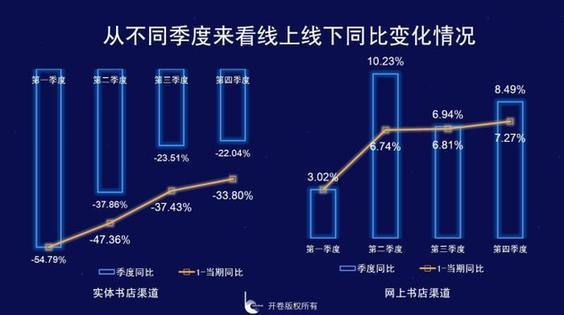 從不同類型書店來看,一二線城市以及超大書城類同比下滑嚴(yán)重,全年同比降幅均在35%以上,從不同季度來看,不同類型書城和整個實體店渠道趨勢變化類似。