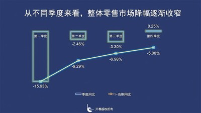 從時(shí)間軸來看,整體零售市場(chǎng)第一季度受疫情影響最為嚴(yán)重,同比下降15.93%,二季度復(fù)工復(fù)產(chǎn)復(fù)學(xué)急速收窄降幅,三季度同比下降3.3%,降幅略增,到第四季度回暖,同比出現(xiàn)小幅上漲,上升了0.25%。