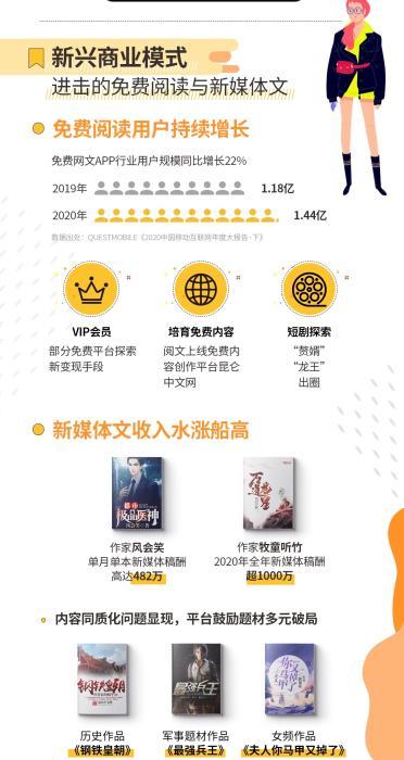 而在近年,免費(fèi)閱讀和新媒體文成為新興商業(yè)模式,得到快速發(fā)展。其中,免費(fèi)閱讀和新媒體文激活了下沉市場(chǎng),成為刺激數(shù)字閱讀市場(chǎng)快速發(fā)展的新興力量,為網(wǎng)絡(luò)文學(xué)的內(nèi)容和用戶(hù)帶來(lái)新增量,也拓寬了網(wǎng)絡(luò)文學(xué)市場(chǎng)規(guī)模。