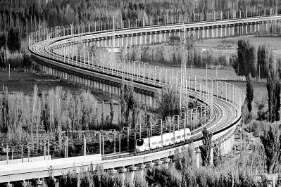 伴隨改革開放大潮,中國發(fā)展日新月異,高鐵、快遞、“天眼”望遠鏡、粵港澳大橋等新事物都被詩人們?nèi)谌朐娦?。圖為行駛中的蘭新高鐵列車。新華社發(fā)(蔡增樂攝)