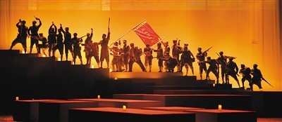 類似這樣耐人尋味、畫龍點(diǎn)睛的改編還有許多,比如原著中的“小彭”變成了“小火柴”,代表了點(diǎn)燃的微火和一種希望;“答答滴滴滴,滴滴滴答答”不僅是符號(hào)化的電碼,而且成為了最好的祝福,一句臺(tái)詞蘊(yùn)含多層含義,滿含深情。從“最后的電波”到“鐵流東進(jìn)”,更展現(xiàn)了一種大歷史觀、大時(shí)代觀,真正符合立體的舞臺(tái)呈現(xiàn)。