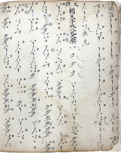 二是音位型曲譜,以各類(lèi)符號(hào)指代樂(lè)器上的音位。使用這類(lèi)曲譜,必須首先明確弦樂(lè)器的定弦、定品方式,管樂(lè)器的開(kāi)孔標(biāo)準(zhǔn)和按孔、吹奏方法,才能確定每個(gè)音位的實(shí)際音高。正因如此,音位譜往往與樂(lè)曲宮調(diào)密切相關(guān)。同一份譜子,換用不同宮調(diào)演奏,音響大不相同。20世紀(jì)初,敦煌藏經(jīng)洞曾發(fā)現(xiàn)一份五代時(shí)期的曲譜,采用20個(gè)琵琶音位符號(hào)記錄,是目前已知這類(lèi)曲譜的早期代表。