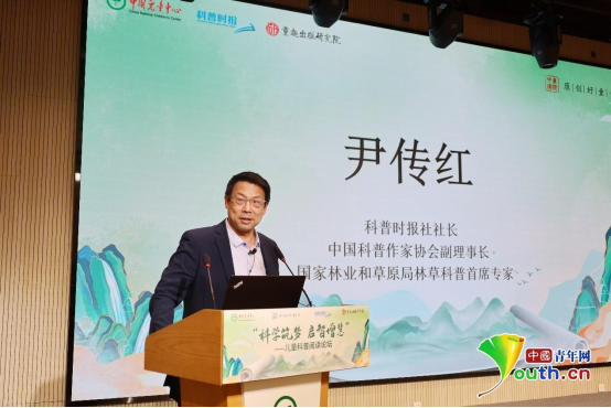 科普時報社社長、中國科普作家協(xié)會副理事長、國家林業(yè)和草原局林草科普首席專家尹傳紅發(fā)表題為“激發(fā)想象力和探求欲的科普閱讀”的主題演講。尹傳紅認(rèn)為科普閱讀可以與孩子的智力發(fā)育同步進行,科學(xué)可能是最能彰顯問題、發(fā)現(xiàn)問題、解決問題的重要領(lǐng)域,科普閱讀能幫助孩子增長知識、增加智慧、增進思想。