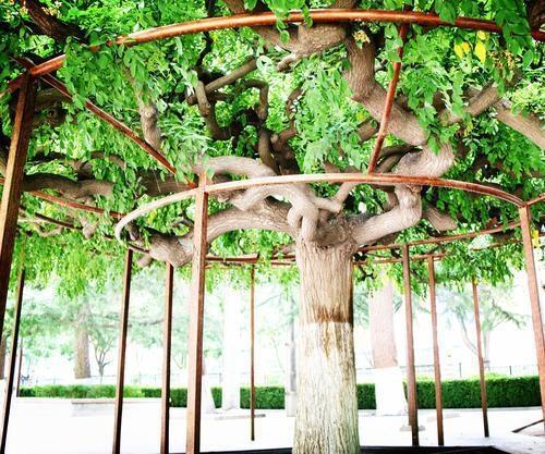博物館里的這兩棵龍爪槐分別種植在展覽大樓前的東西兩角,是博物館的老專家郭維屏先生所種植。1959年秋冬,甘肅省博物館從通渭路舊館搬遷到七里河的新館,新館內(nèi)一片荒涼,亟待綠化。而就在此時,郭維屏老先生調(diào)入博物館工作,參與到館內(nèi)的綠植規(guī)劃建設(shè),也正好發(fā)揮自己的藝術(shù)特長。這兩棵龍爪槐的幼株是郭老先生從五泉山苗圃選購的,栽種到展覽大樓前院的東西兩角,槐樹的周圍還設(shè)計了幾個形狀不一的花壇,花壇內(nèi)種植了各色各樣的樹木,一眼望去郁郁蔥蔥,生機(jī)盎然,頗有些韻味。這兩棵龍爪槐剛栽種時體型嬌小,看起來很不起眼。經(jīng)過郭老先生和博物館幾代人的悉心栽培,如今已是樹冠優(yōu)美,花香四溢。每到槐花盛開的時候,滿庭飄香,沁人心扉,成了博物館里一道靚麗的景色,引得路人駐足欣賞。東角的龍爪槐高約2米,樹干粗達(dá)2尺多,樹冠如傘,頂端長出八、九個主枝向四面伸展,屈曲盤繞,而后又分為數(shù)十個中枝和數(shù)百個小枝,互相攀援,屈折如爪,一枝獨秀。而西角的龍爪槐因基建的原因長勢受到一定影響。