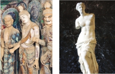 可是,“脅侍菩薩微笑著,在她低垂的眼中可能根本沒(méi)有勝負(fù)這回事。這種眼神是利他而非個(gè)人的……當(dāng)我們?cè)?5窟佛龕前微微俯下身子之時(shí),溫暖的奇跡出現(xiàn)了,她正慈祥地看著你。一位是由堅(jiān)硬的大理石所雕,另一位是由敦煌本地黏土所塑,維納斯和脅侍菩薩似乎代表了兩種生活態(tài)度。假如她們?cè)诒R浮宮中相遇,談?wù)撈鹈?。維納斯可能會(huì)唱起女詩(shī)人薩福的詩(shī)歌:‘你愛(ài)的就是美的。這容易解釋。’脅侍菩薩則依然保持微笑,靜靜地看著維納斯”。