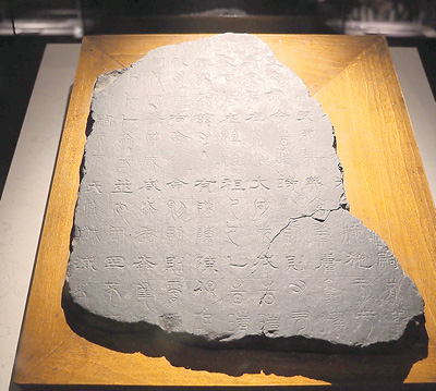一塊三國時期的正始石經殘片上,古文、小篆、隸書三體呈“品”字形排列,與其他石經三體直下排列的形式不同,體現了正始石經刻銘形式的多樣性。此石為《尚書·臯陶謨》殘篇,存“言”“帝”等字。據悉,目前所見這一形式的正始石經僅有《尚書》之《堯典》與《臯陶謨》兩篇。