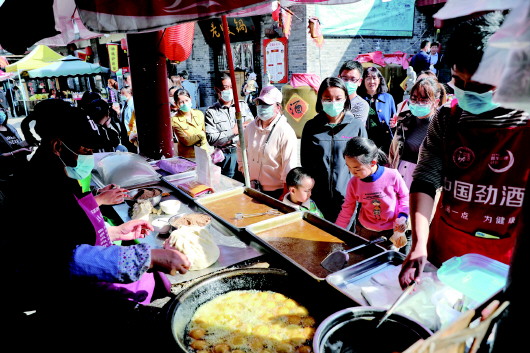 3月22日,在崆峒古鎮(zhèn)小吃一條街購買小吃的游客排起了長隊(duì)。記者 姚志強(qiáng) 攝