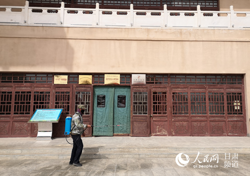 3月21日起,瓜州縣世界文化遺產(chǎn)鎖陽城遺址景區(qū)和草圣故里文化產(chǎn)業(yè)園恢復(fù)開放。圖為張芝紀(jì)念館工作人員正在進(jìn)行消殺工作。(李雪 攝)