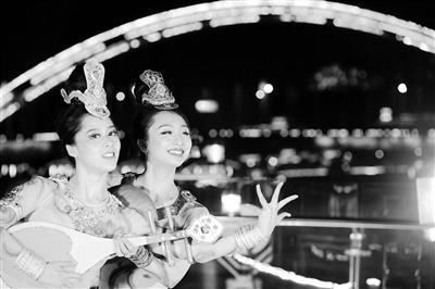 晚上8時(shí)許,金城壹號(hào)、金城叁號(hào)、如意甘肅號(hào)三艘游船徐徐啟航。當(dāng)游船駛至中山橋下,來(lái)自本地的藝術(shù)家們演奏起獨(dú)特的民族舞曲,吸引了無(wú)數(shù)行人駐足凝望。