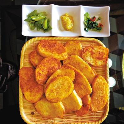 炕鍋洋芋是臨夏農家樂里面常見的一道特色小吃,在臨夏,煎、烙之類的烹飪方式都被稱作炕,炕鍋洋芋因此得名。洋芋切片后,直接放熱油中兩面煎透??诲佈笥蟮淖龇m不復雜,但其對于火候的要求卻極其嚴苛,多一分會焦,少一分則不熟。