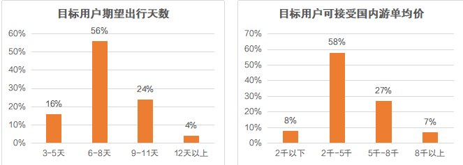 關于出行方式,一部分客戶表示,“現(xiàn)在機票便宜、酒店也不貴,自己訂也挺方便的”;一部分客戶表示,“想去玩的人應該不少,找旅行社安排跟個團,應該能省點心”。從整體數(shù)據(jù)來看,選擇自由行/半自助游的客戶占比42%,選擇傳統(tǒng)跟團游和私家定制的客戶總和與之持平,總占比46%。