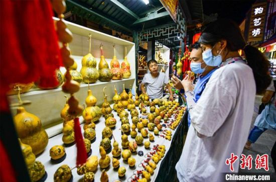 圖為游客購(gòu)買(mǎi)刻葫蘆工藝品。 王斌銀 攝