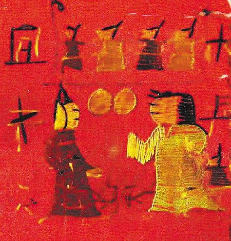 漆器人物畫有羽人、舞人等。圖畫多用粗線勾勒,靈動(dòng)傳神,色彩簡(jiǎn)單明快,賦性若神若人,給人以很大的思索想象空間。如甘肅武威磨嘴子48號(hào)漢墓出土的車馬舞蹈漆樽,木胎徑約20厘米,腹部殘留銅獸面鋪首兩個(gè),朱漆底,黑漆繪垂帳紋及車馬出行和舞蹈等兩組畫。舞蹈畫上有三個(gè)束腰窄袖,體型矯健的男子在旋轉(zhuǎn)起舞。畫家只用寥寥幾筆,就勾勒出強(qiáng)烈的動(dòng)感美;旁繪幾團(tuán)云紋,又平添了空靈的氣氛。這幅漆畫的構(gòu)圖技法、人物安排及對(duì)其神韻的刻畫,都達(dá)到了漢代漆畫的高水平。