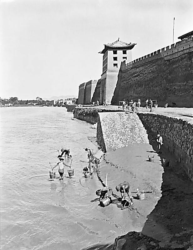 第二張是水客子在黃河中取水的情形??雌饋?,似乎是黃河大水之后,人們從河中取水。黃河邊的石堤下,堆積的淤泥,還沒有清理。以前,蘭州城墻的位置,就是今天的南濱河路。從淤泥堆積的高度看,這次黃河大水應(yīng)該不小。