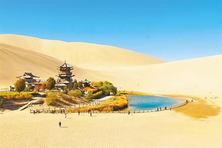 鳴沙山月牙泉是敦煌諸多自然景觀中的佼佼者,古往今來以“沙漠奇觀”著稱于世,被譽為“塞外風(fēng)光之一絕”。月牙泉、莫高窟九層樓和莫高窟藝術(shù)景觀融為一體,是敦煌城南一脈相連的“三大奇跡”,成為中國乃至世界人民向往的旅游勝地。