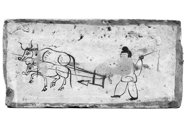 牛耕圖的兩頭牛也不尋常,畫得很傳神。白磚,橘紅色勾邊為框。墨線白描出兩頭牛,一頭健壯,似是公牛,一頭痩勁,似是母牛。痩勁之牛,能看到腿,牛腿使勁,一蹄前行,眼神炯炯,盯著前方,奮力前行。健壯之牛,在里面,看不到牛腿,但脖子稍彎,似乎看著觀看壁畫磚的觀眾,這還不算,它不時回眸一瞥,給你賣個萌。