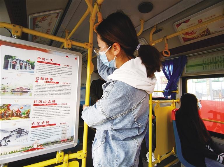 黨史學(xué)習(xí)教育主題車(chē)廂的車(chē)體外部掛有醒目的黨史宣傳標(biāo)語(yǔ),走進(jìn)車(chē)廂,風(fēng)道展板上以黨史故事的形式,圖文并茂、生動(dòng)形象地展示著紅船精神、井岡山精神、長(zhǎng)征精神、遵義會(huì)議精神、延安精神、西柏坡精神、抗美援朝精神、戰(zhàn)疫精神等內(nèi)容。車(chē)廂內(nèi)的座椅靠背、宣傳欄等處也印有不同的黨史宣傳知識(shí),公交車(chē)廂成了黨史學(xué)習(xí)教育的流動(dòng)“微課堂”。乘坐在黨史學(xué)習(xí)教育主題公交車(chē)上,乘客便可重溫中國(guó)共產(chǎn)黨波瀾壯闊的輝煌歷程,汲取民族復(fù)興的精神力量。