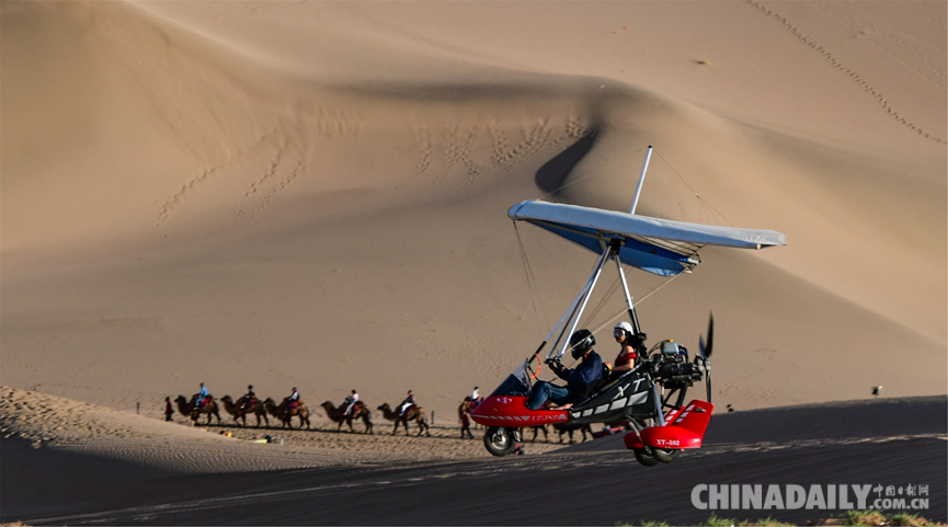 5月6日,游客乘坐滑翔機(jī)從空中鳥瞰敦煌大漠風(fēng)光。