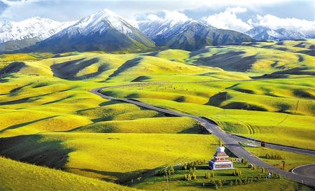沿著國道227行走,放眼望去,遠(yuǎn)處祁連山脈高峰聳立,近處起伏的山丘高低錯(cuò)落,山間綠草如茵,色彩斑斕的野花星星點(diǎn)點(diǎn)播撒在綠草之中。山坡上點(diǎn)綴的牛羊安靜地吃草,呈現(xiàn)出一派安靜祥和的田野風(fēng)光。最耀眼的當(dāng)屬這里的油菜花,處處可見金黃一片,成為七月河西走廊一道亮麗的風(fēng)景。