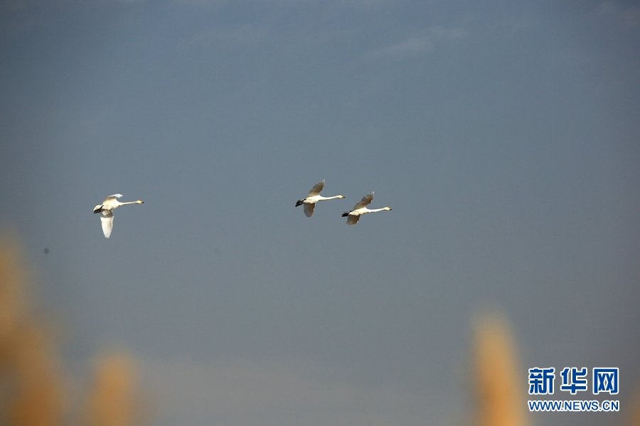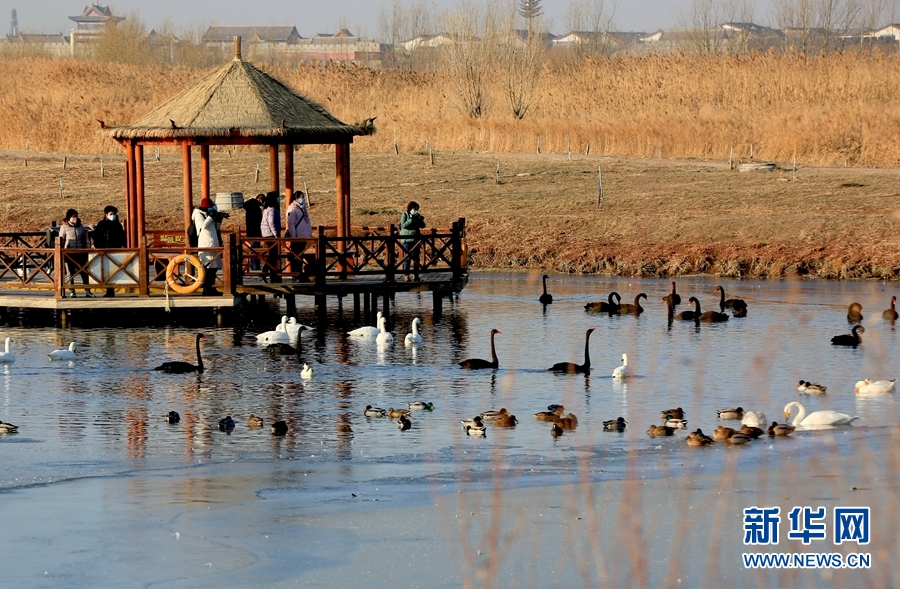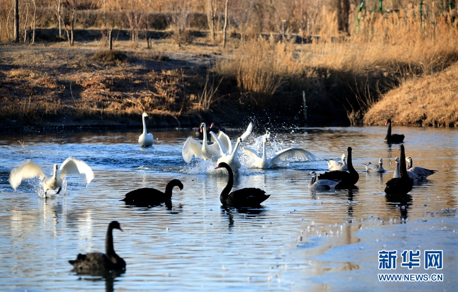 冬日清晨的甘肅省張掖國(guó)家濕地公園里碧波蕩漾,成群的白天鵝、黑天鵝等鳥(niǎo)類(lèi)聚在一起游弋嬉戲,歡騰跳躍,成為一道亮麗的風(fēng)景線,吸引眾多游客觀賞拍照。新華網(wǎng)發(fā)(陳禮 攝)
