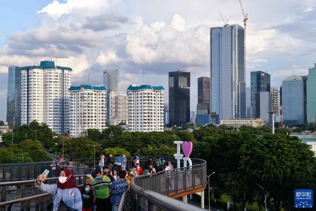 1月23日,人們在印度尼西亞雅加達史納延公園的空中步道欣賞城市風光。