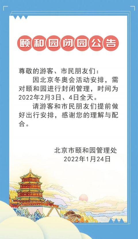 北京市頤和園管理處發(fā)布消息稱,為配合北京冬奧會活動安排,2月3日、4日全天頤和園景區(qū)將全園閉園。