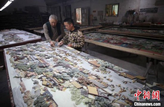 在瑞安市陶山鎮(zhèn)霞林村的陶峰工藝雕刻廠,彩石鑲嵌藝人李成者等人完成了彩石鑲嵌作品《清明上河圖》其中一部分。各色各樣的彩石流光溢彩,在工藝師傅的手中雕刻或拼接成一座座富麗堂皇的院落建筑,街道上絡繹不絕的車輛,集市上熙熙攘攘的人群……人物、場景栩栩如生,讓人嘆為觀止。