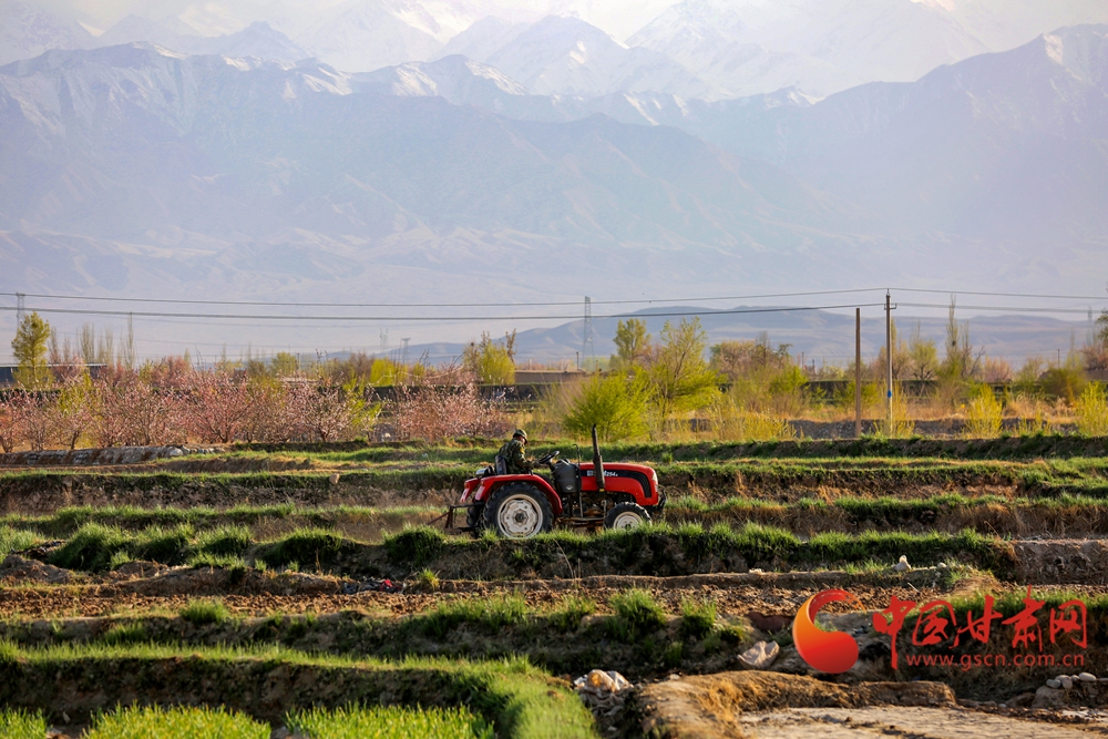 谷雨時節(jié),甘肅省酒泉市肅州區(qū)西洞鎮(zhèn)農(nóng)民搶抓農(nóng)時,忙碌在田間地頭,遠處的祁連山與近處的田園風(fēng)光,構(gòu)成了一副美麗的春日農(nóng)耕畫卷。