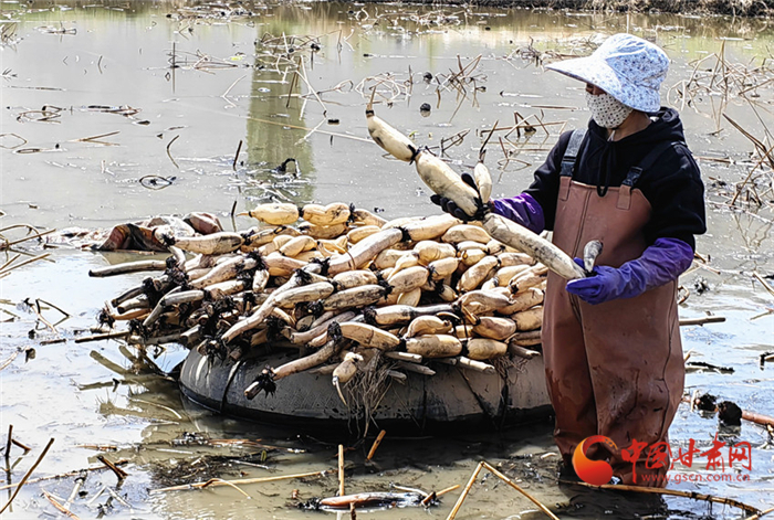 “我們就是東灘村人,在這個(gè)養(yǎng)殖場上班,離家近也方便,采藕一年下來能收入2萬多,平時(shí)還種地和外出打工,收入挺好的。”李愛芝一邊裝著蓮藕一邊說。