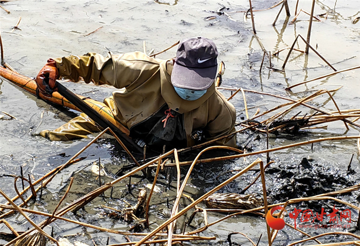 李愛芝是青城鎮(zhèn)東灘村村民,一大早她便和丈夫張興成換好了裝備,進(jìn)入池塘里開始采摘蓮藕。張興成憑著手中高壓水槍“探路”,一步步艱難挪動(dòng),在淤泥里手腳并用尋找肥壯的鮮藕,幾乎整個(gè)身體都是趴在水面上,佝僂著腰,雙手盡力伸入淤泥,張興成的挖藕效率還算不錯(cuò),伴隨著一連串嫻熟的動(dòng)作,不一會兒,一根根粗大的蓮藕漂浮在他身旁的水面上,李愛芝則將蓮藕身上的淤泥清洗干凈后裝拉回岸邊進(jìn)行分裝。