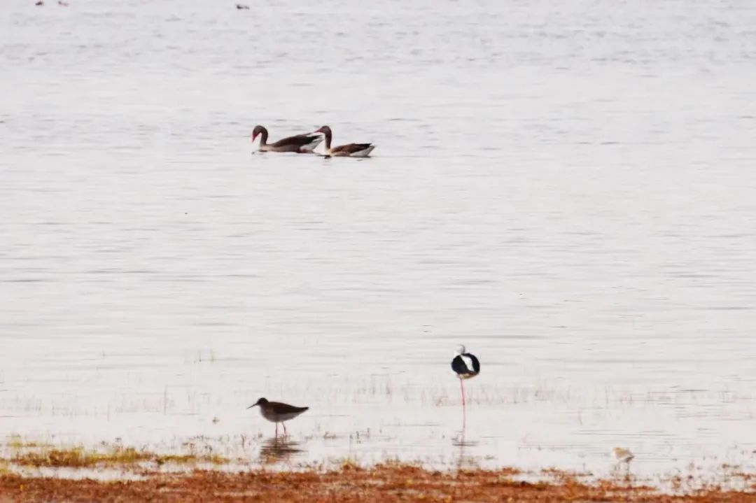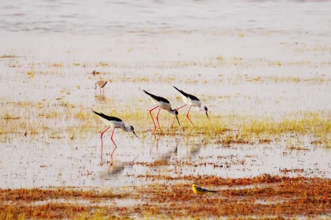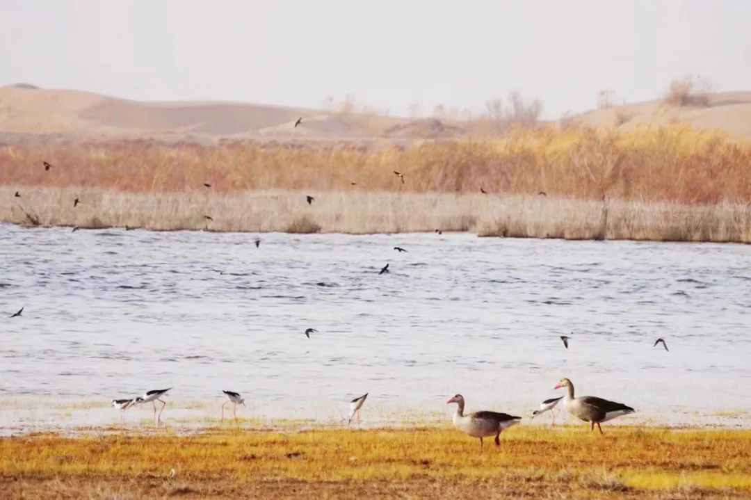 四月的敦煌大地春和景明,在庫姆塔格沙漠的邊緣,位于陽關(guān)濕地的壽昌海子波平如鏡,碧水映襯著祁連山上的雪峰,各種色彩斑斕地鳥兒仿佛收到了春天的邀約,在這里參加一場盛大的聚會。它們有的在湖面上引頸入水自在覓食,有的踏波翩翩起舞,有的追逐嬉戲鳴唱,有的在岸邊閑庭信步、悠然自得地曬太陽......構(gòu)成了一幅多姿多彩的和諧自然生態(tài)畫卷。