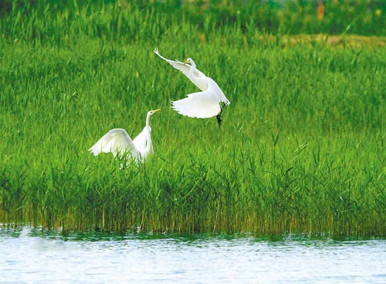 初夏的甘肅張掖國家濕地公園蘆葦青青,幾只白鷺在綠色的蘆葦中時而嬉戲飛翔,時而駐足覓食,成為濕地一道美麗風景。 人民網(wǎng)照片