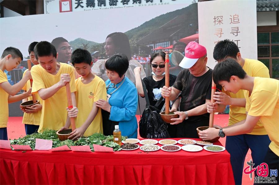 千人擂茶的場(chǎng)面,更是當(dāng)天的重點(diǎn)戲。游客們借助擂棍和擂缽,跟隨著非遺傳承人老師的節(jié)奏,將擂缽里的材料一一敲碎,擂出了濃郁的茶香味,也擂出了濃濃的客家情。