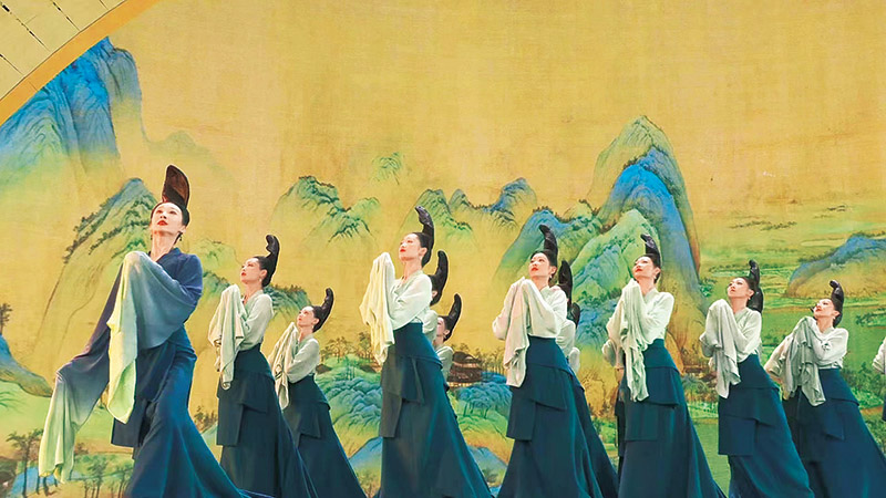 圖為圍繞傳世名作《千里江山圖》創(chuàng)排的舞蹈詩(shī)劇《只此青綠》亮相2022年中央廣播電視總臺(tái)春節(jié)聯(lián)歡晚會(huì)(視頻截圖)?!≈醒霃V播電視總臺(tái)供圖