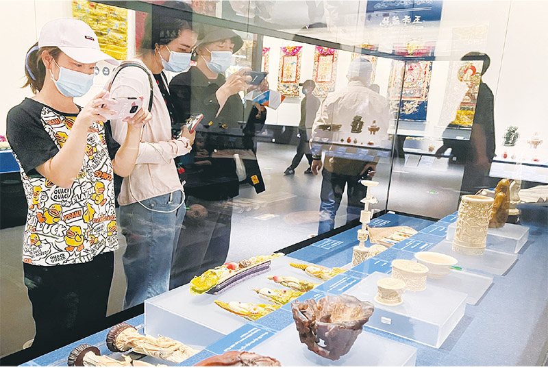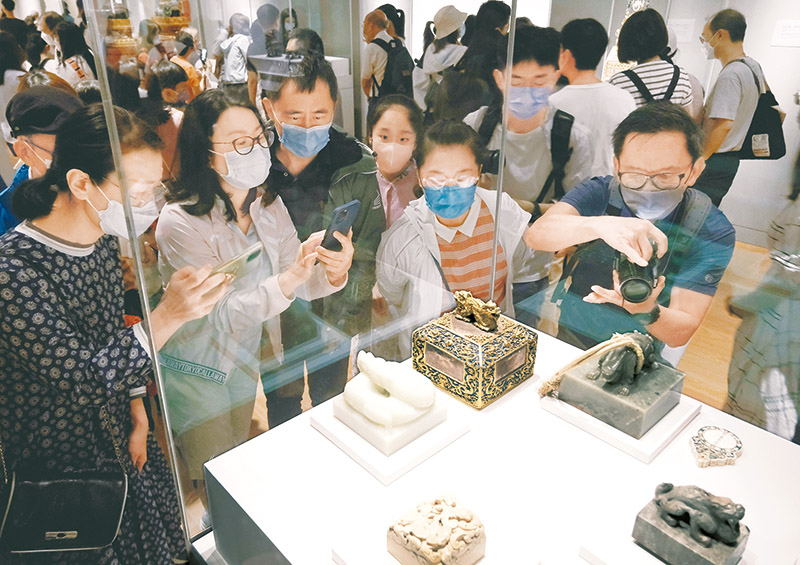 2022年7月3日,香港故宮文化博物館正式對(duì)公眾開放參觀。圖為觀眾在香港故宮文化博物館展廳內(nèi)參觀拍照?!⌒氯A社記者 王申/攝