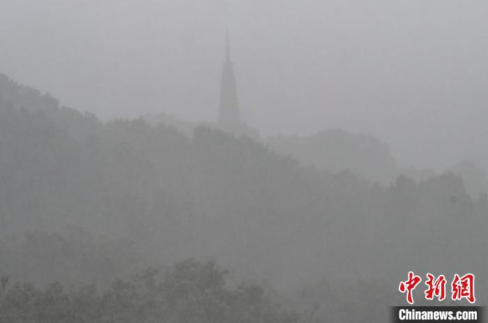 圖為西湖保俶塔在大雨中若隱若現(xiàn)。 王剛 攝