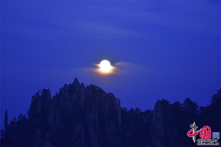 9月10日,中秋之夜,7點左右月亮如約而至,躍出地平線,穿過群峰峻嶺,露出了它靚麗的臉龐。剛出的時候,月亮和初升的太一樣是帶紅色的,隨著慢慢的升起越來越明亮,這時的黃山在月光照射下變得很清新。(姚育青)