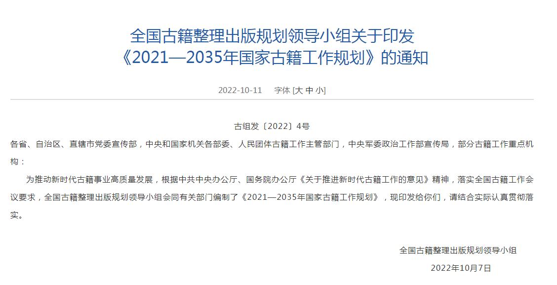 12日,據(jù)國家新聞出版署網(wǎng)站消息,全國古籍整理出版規(guī)劃領(lǐng)導(dǎo)小組會同有關(guān)部門編制了《2021—2035年國家古籍工作規(guī)劃》,其中提到,至2035年,古籍工作體制機(jī)制更加完善,以重大工程為引領(lǐng),加強(qiáng)古籍工作全局性謀劃,重點(diǎn)實(shí)施 《永樂大典》、敦煌文獻(xiàn)系統(tǒng)性保護(hù)整理出版工程等。