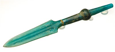 來自湖南博物院的西漢玻璃矛是本次展覽的明星展品之一。玻璃矛為綠色半透明狀,長18.8厘米,刃寬2.2厘米,矛脊兩側(cè)有槽,矛柄作圓柱狀,柄中部凸起成圓球形。這種兵器造型的玻璃制品非常罕見,專家推測其為禮器或明器。這件玻璃矛是本土工匠在吸收地中海玻璃制造技術(shù)的基礎(chǔ)上制作而成,反映了西漢玻璃工藝的高超水平,是研究玻璃文化傳播的重要實物資料。