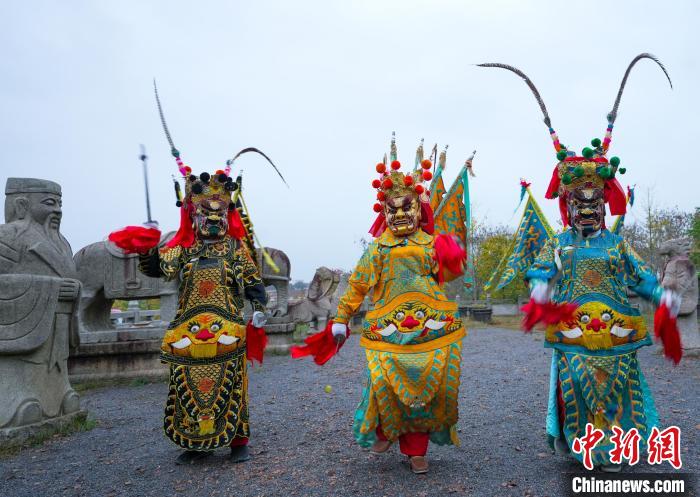 郎溪縣國家級(jí)非遺跳舞猖在郎溪縣濤城鎮(zhèn)慶豐村大佛山養(yǎng)心谷展演?!±顣约t 攝
