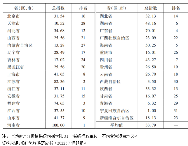 近日,北京第二外國(guó)語(yǔ)學(xué)院旅游科學(xué)學(xué)院與社會(huì)科學(xué)文獻(xiàn)出版社共同發(fā)布了紅色旅游藍(lán)皮書(shū)《中國(guó)紅色旅游發(fā)展報(bào)告(2022)》(以下簡(jiǎn)稱(chēng)《藍(lán)皮書(shū)》)。《藍(lán)皮書(shū)》指出,中國(guó)紅色旅游發(fā)展水平持續(xù)提升,31個(gè)省級(jí)行政單位(不含港澳臺(tái)地區(qū))的紅色旅游發(fā)展指數(shù)排名中,位列前十的依次為河南省、江蘇省、福建省、廣東省、海南省、湖南省、四川省、上海市、山東省、江西省。