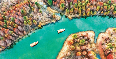 近年來,江蘇省宿遷市宿豫區(qū)大力發(fā)展“農(nóng)旅+產(chǎn)業(yè)+文化”鄉(xiāng)村旅游,圖為宿豫區(qū)新莊彬荷園濕地里,五彩斑斕、錯(cuò)落有致的紅杉樹與清澈碧綠的河水相互映襯,猶如一幅色彩艷麗的“杉”水畫。陳紅 攝(人民圖片)